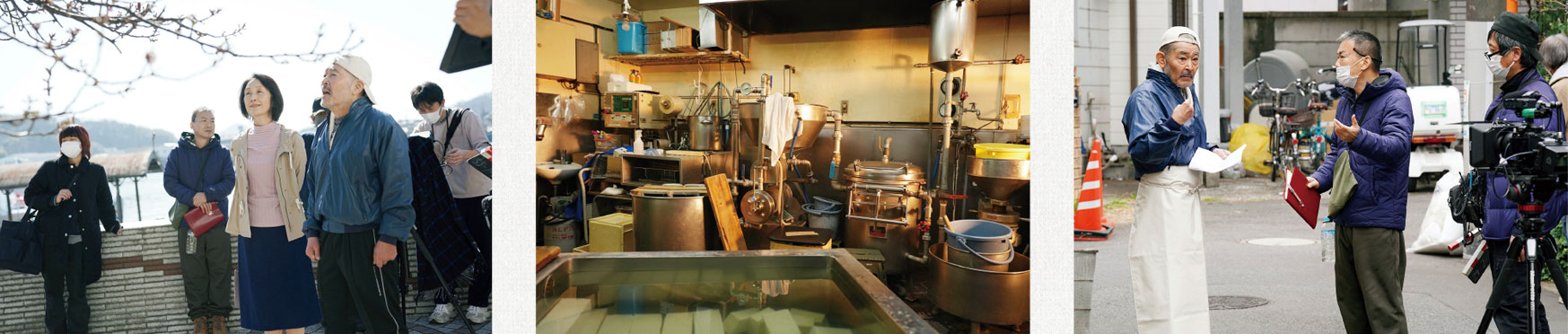 ある日、撮影に向かう途中で豆腐を作っている姿を目にしたとき、ふと、この人たちは豆腐を愛していているんだろうなぁと思った。豆腐は、水と大豆とにがり、そして職人の腕で作られる。限られた素材で勝負しているのは、とても格好よくて。そこに生き方の美意識を感じました。彼らが豆腐を作る姿と、自分が映画を作る姿が重なって、藤竜也さんの演じる豆腐職人の姿が自然と浮かんできた。そこからストーリーが見えてきました」と三原監督は語る。『村の写真集』では頑固一徹な写真屋、『しあわせのかおり』では年老いた中国出身の名料理人、今回は小さな豆腐屋の店主が主人公。藤竜也×三原監督、職人三部作とも言える記念すべき作品となった。この映画は、高野豆腐店の朝、豆腐作りのシーンから始まる。「ドキュメンタリーのように、豆腐作りをしっかりと映し出したかった」と、丁寧に豆腐作りの過程をカメラが追う。工場で始まり工場で終わることにもこだわった。